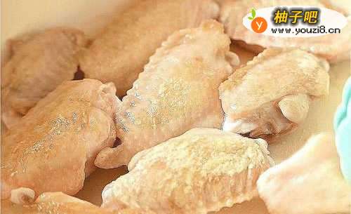 把鸡翅洗净印干,加入盐、生粉、麻油和绍兴酒,用手按摩至腌料被吸收。腌15分钟以上。