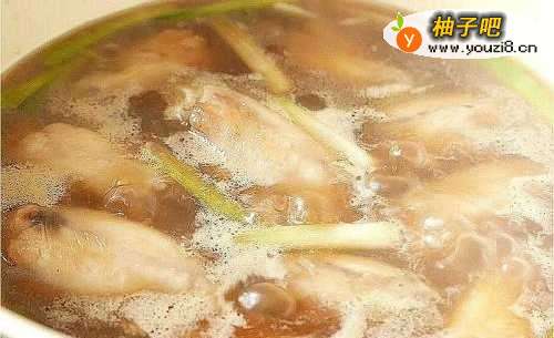 3加入姜和葱白炒2-3分钟至闻香后,加入水、蚝油、冰糖和老抽拌匀煮滚。盖上盖,调至中小火煮5分钟,打开把鸡翅翻面,再盖上多煮5分钟。