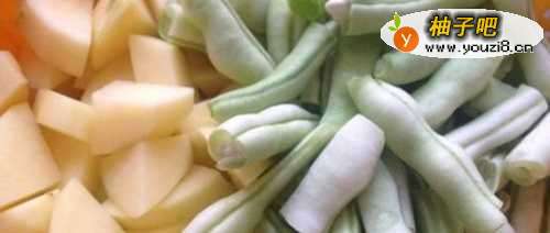 首先,把我们所需要的菜都准备好,清洗干净,之后把土豆切条或者切块都行,把芸豆掰成一段一段的即可,如下图所示。