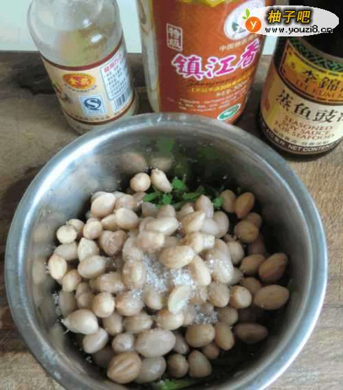 4把花生米芹菜放入碗中加入白糖,蒸鱼豉油,香醋。