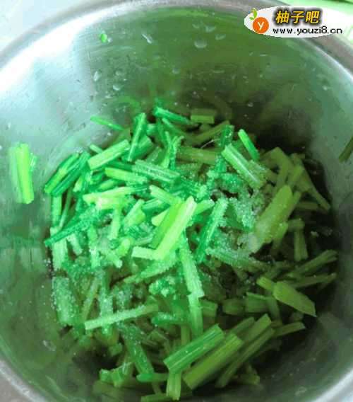 3芹菜切段加入盐腌制片刻。