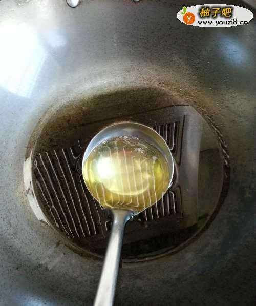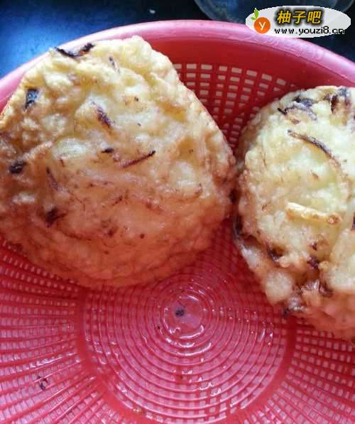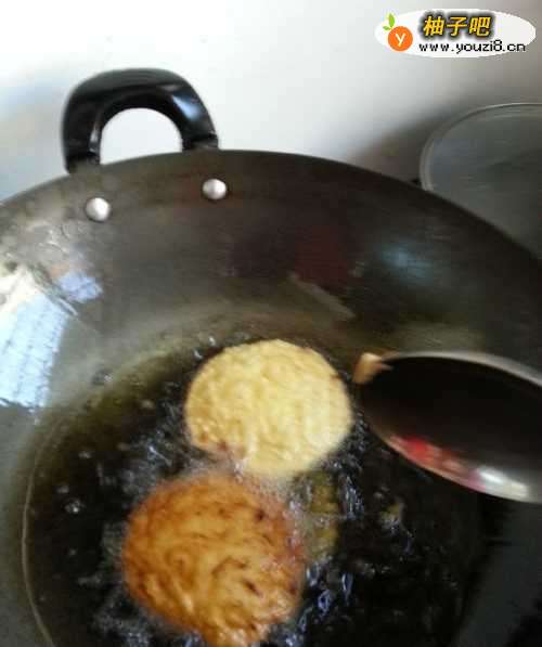 6先在勺子里放一层面糊,然后放入萝卜丝,在淋上一层面糊,放入锅中煎炸,30秒后,用勺子轻敲锅壁,灯盏糕自然脱落,在油锅中翻转在煎炸至两面金黄,即可捞出