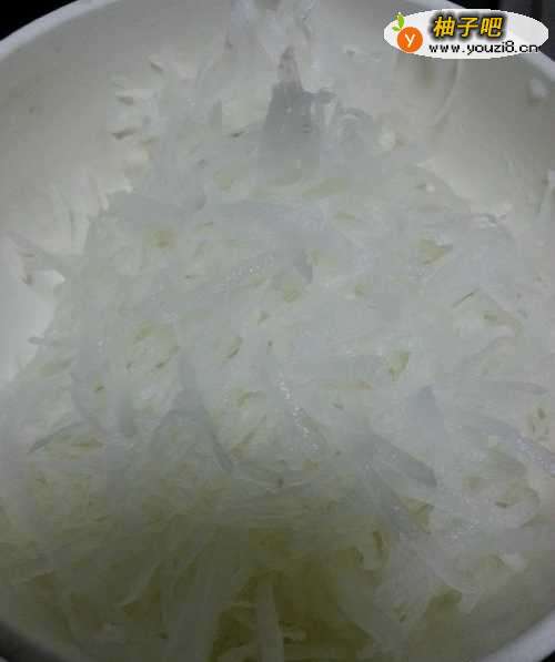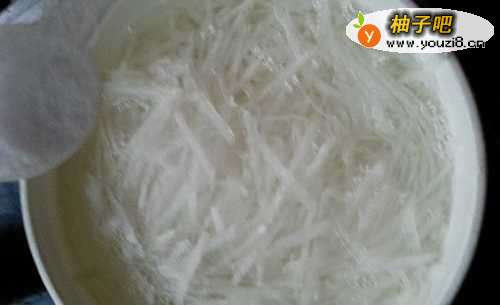 4萝卜丝泡好后,清洗下,沥干水分,加适量盐搅拌均匀,入味