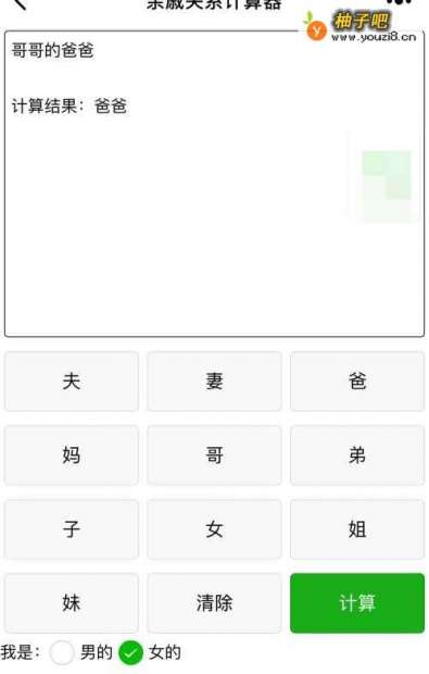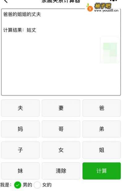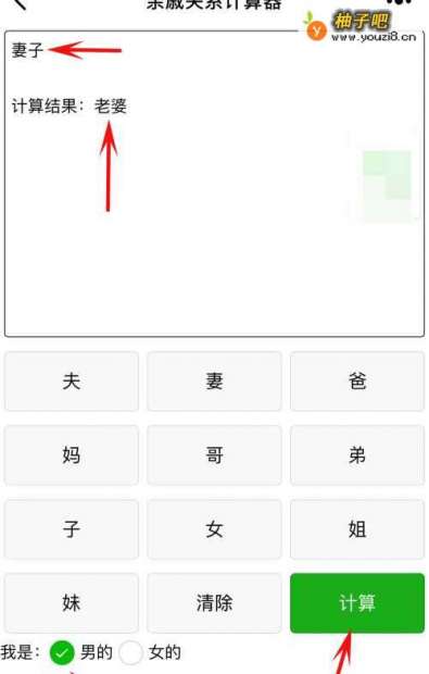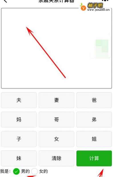 你点中,我是”男“,然后依次点击”爸爸“”姐姐“”丈夫“再点击”计算“就可以了。