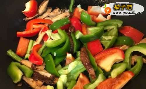 5加入青椒红椒,继续翻炒3-5分钟。