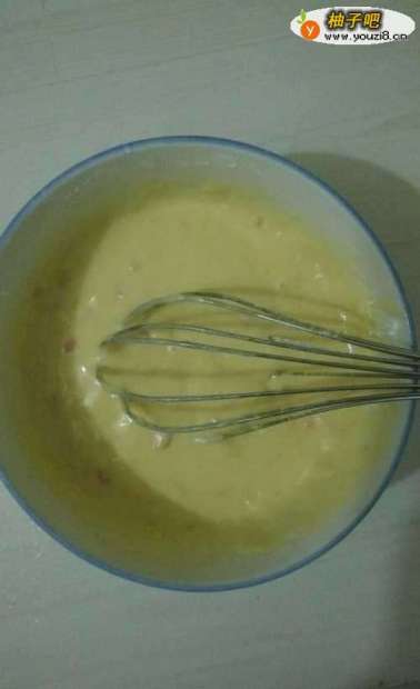 2将步骤一中材料混合,再加入铲沃讨白糖,奶粉,橙汁粉,泡打粉政哨,食用油。混合均匀成糊状。如果稠的话,可以加一点水。