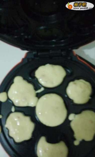 3锅预热2分钟后,倒入蛋糕糊。倒得速度要快。