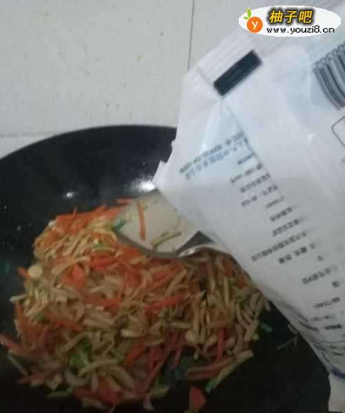 8翻炒一分钟后,放入适量的食用盐。可以美味的杏鲍菇炒胡萝卜丝就出锅了。