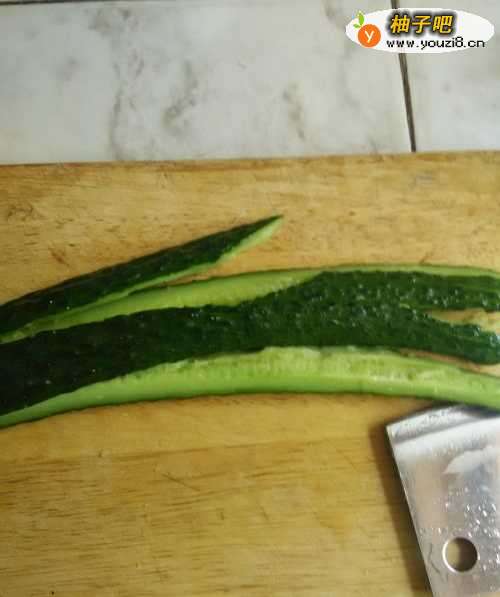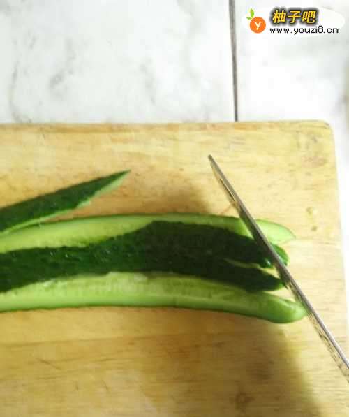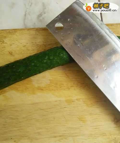 3把黄瓜平放在菜板上,用刀先拍右端。