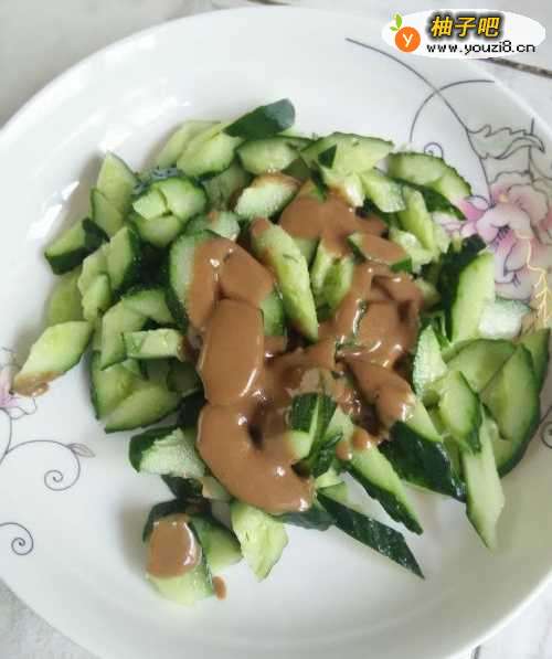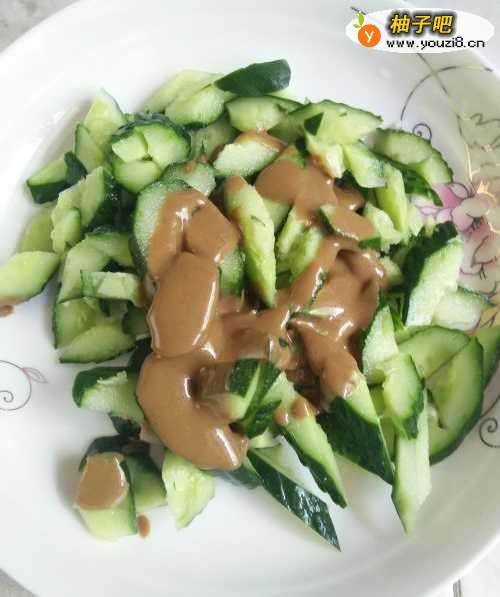 9再把两勺芝麻酱浇在黄瓜上,然后拌匀,一盘爽口的黄瓜就做好了。