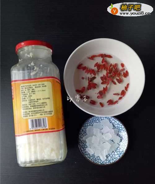 3再备好其他食材:冰糖,酒酿,枸杞;枸杞用适量清水浸泡片刻;