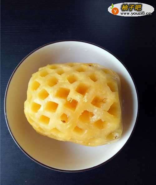 2菠萝去皮,这步可以让店家代劳;菠萝切丁,中间的硬心不用去掉;菠萝丁用适量淡盐水浸泡片刻;