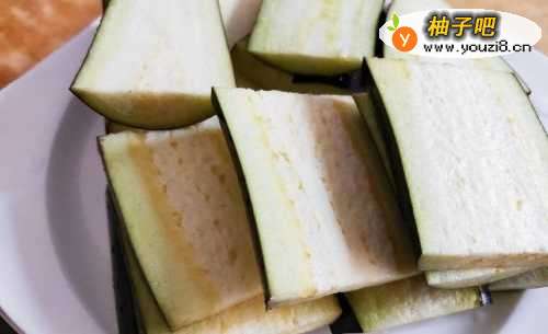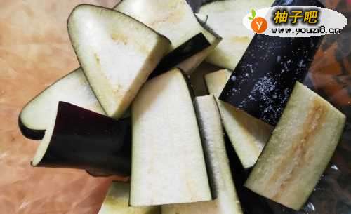 3茄子片上,撒上少许盐,腌制10分钟左右,茄子冲洗一下沥干水分;