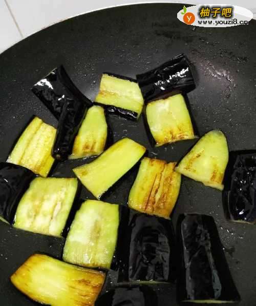 4起锅热油,将茄子放入锅中煎一下,先用大火煎1分钟左右,然后转小火,待煎至金黄,翻面煎,煎好的茄子盛出放盘里备用;