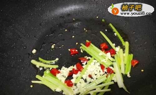 5锅里倒入一些油,放入蒜、小米椒芹菜爆香;