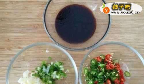 醋三勺、酱油一勺、糖半勺、蚝油少许、香油少许、盐少许调和成汁。蒜切碎、葱切小段,湖南椒、指天椒切小段。