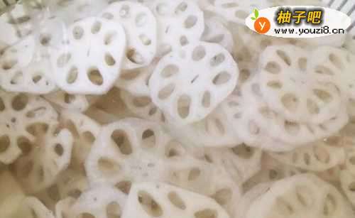 3藕切薄片,为了防止藕变色,可以将切好的藕放入清水中,并且在水中倒几滴醋。