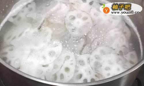 5水烧开后,倒入藕片,喜欢脆的煮2、3分钟即可以捞出来。