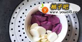 紫薯和芋头切片放入蒸锅中蒸熟蒸软。