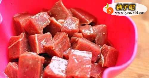 2牛排切成方形牛肉粒,加入盐、蚝油、白葡萄酒、黑胡椒、生抽、水淀粉拌匀腌渍半个小时;