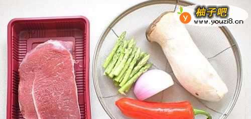 7连同汤汁一起将牛肉粒倒入锅里,和杏鲍菇一起翻炒至上色;放入红椒片翻炒几下即可出锅;另起一锅放水烧开,加少量盐,把芦笋放入水中焯熟。