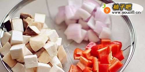 3杏鲍菇切成同牛肉粒大小一致的方形,洋葱和红椒切成片备用;