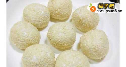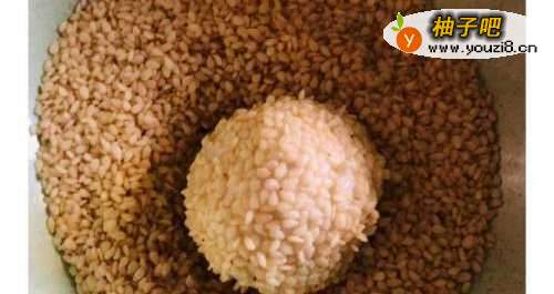 6白芝麻里滚一圈,再搓圆,主要是为了芝麻粘得牢一点。