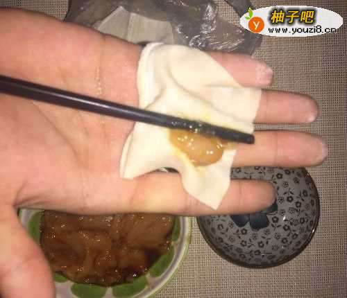 4然后用筷子沾上一些肉馅,平铺到扁食皮的中间。在沾肉馅的时候,最好先把筷子用水沾湿,这样的话就不会让筷子沾满了肉馅了。