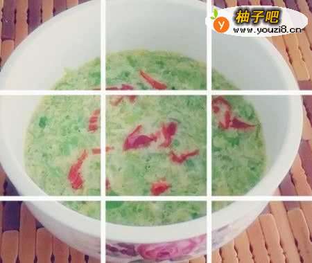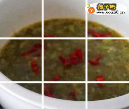 4把葱,姜和辣椒放进鸡蛋碗里,搅拌均匀,边搅拌边加入水,注意水不要加的太多,感觉上不要太稀,再加入1勺黄豆酱和少许豆油,搅匀。