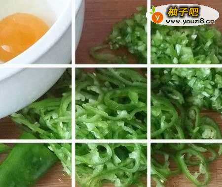 2辣椒清洗干净,切成丝后,再把它切碎。鸡蛋打散在碗里。