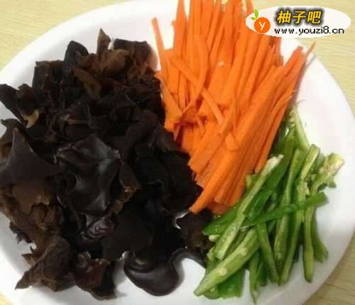 胡萝卜切丝,青椒洗净切丝,木耳撕成小块备用