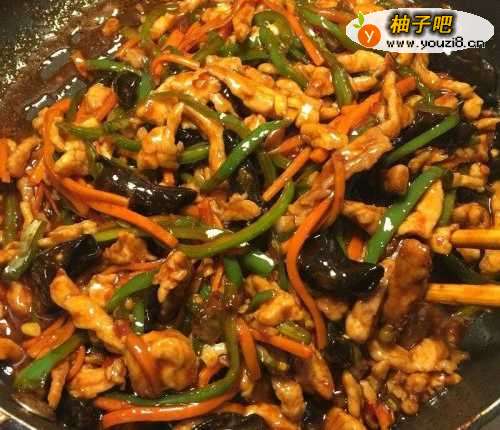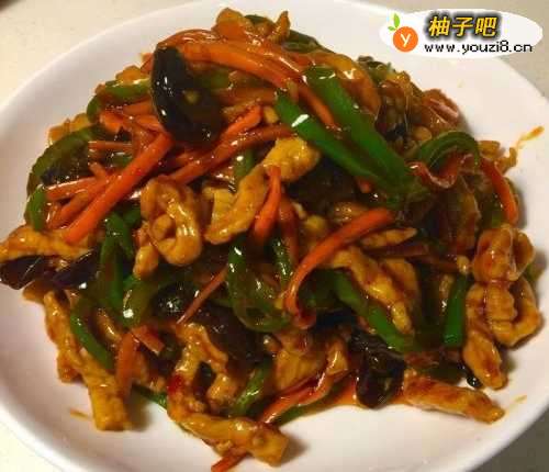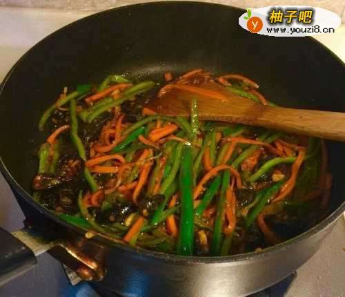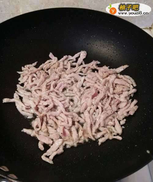 5坐锅倒油,把浆好的肉下锅划散,炒到肉丝变白色移至盘中待用