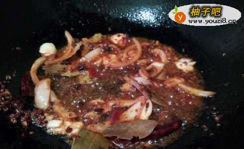 3热锅凉油,下花椒,香叶,郫县豆瓣酱,火锅底料,洋葱丝干辣椒,小火炒香