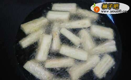 5:锅中倒油烧热,将茄子放进去炸至外表焦黄后捞出备用。
