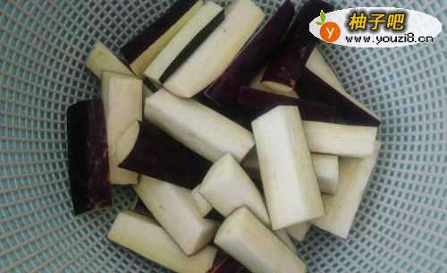 茄子去掉头尾洗净,切成长条状。(茄子皮可以不用削)