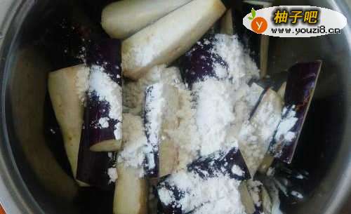 4:茄子里倒入两汤匙玉米淀粉抓匀。