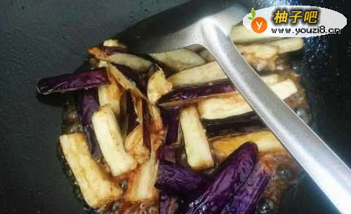 5锅中倒油烧热,将茄子放进去炸至外表焦黄后捞出备用。