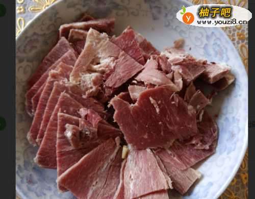 准备一块牛肉,生的熟的都可以,然后把它切成片,冷冻后会更好切,薄厚在两厘米这样,然后放在盘中备用