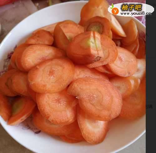 2准备两三个胡萝卜,斜着切片,大小和薄厚要差不多,放入盘中备用。准备葱,姜,干辣椒等辅料