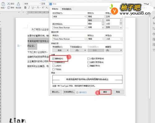 4在“字体”对话框中,勾选【删除线】,点击【确定】即可。