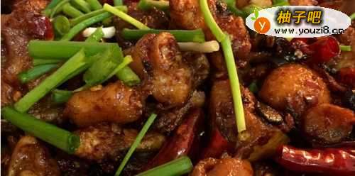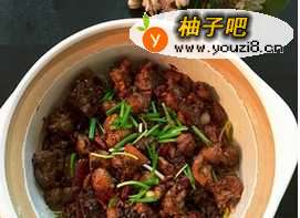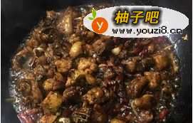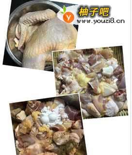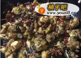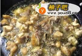 4热油(多一点)倒入腌好的鸡块煸炒,炒到鸡块水分干燥,表面金黄,鸡肉收缩,鸡皮出油时控油盛出---此时的鸡肉已经大半熟了;