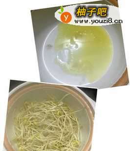 5留底油适量,倒入洗净沥干的黄豆芽翻炒断生,调少量食盐,铲出垫在钵底---绿豆芽水分重,炒制时出水厉害,不能用