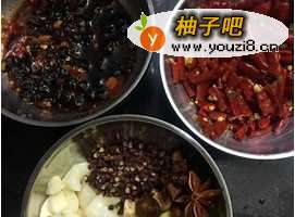 2干辣椒洗净,浸泡一会儿后剪成短节,豆瓣酱适量剁细与豆豉混合,姜切小片蒜切大粒和各种香料(花椒粒、八角、山奈、草果、桂皮、香叶等)放在一起