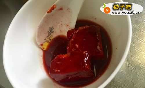 3在猪蹄焯水过程中可以将腐乳挖出来碾碎,加入一碗冷水,姜蒜切好备用!