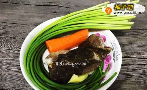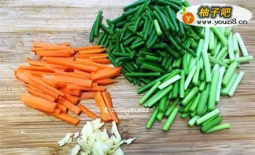 2把蒜苔、姜和胡萝卜分别洗干净,切好。