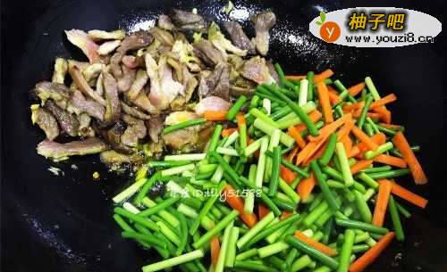 7蒜苔和胡萝卜炒熟后,加入一点点盐(或者是不用放盐,因为腊瘦肉是比较咸),少放一点蚝油炒均匀,关火。