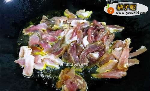 4热锅凉油,把腊瘦肉放进锅里用大火翻炒3分钟。