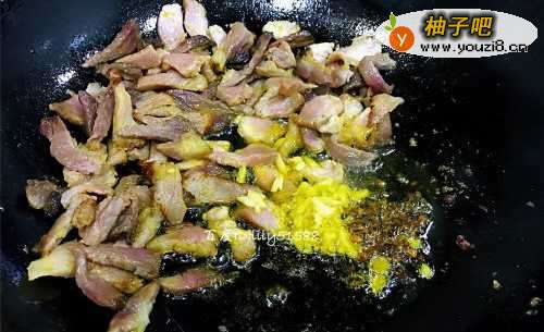 5锅里的腊瘦肉炒变色后,放入姜末加点料酒一起炒几下,去除腥味。