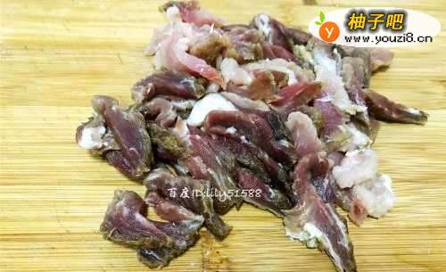 3腊过的瘦肉看起来黑黑的,但是味道是特别香的。把它洗净后,切好备用。