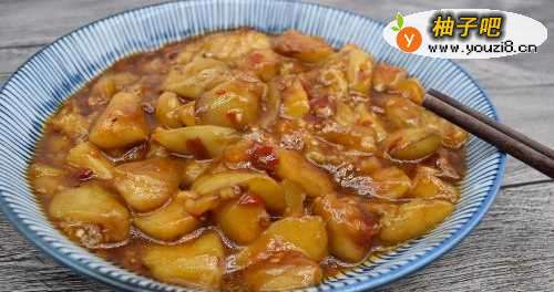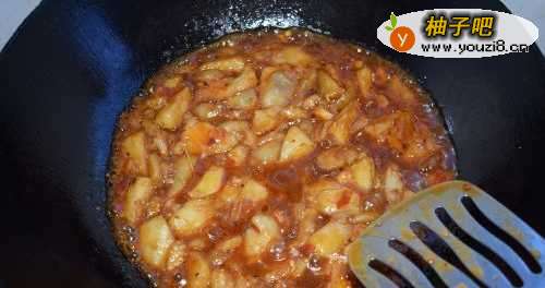 44,锅中留一点油即可,放入大蒜和辣椒煸炒下,再放入茄子,一勺生抽酱油,少许白糖,一勺豆瓣酱,适量水淀粉煮上片刻起锅。
